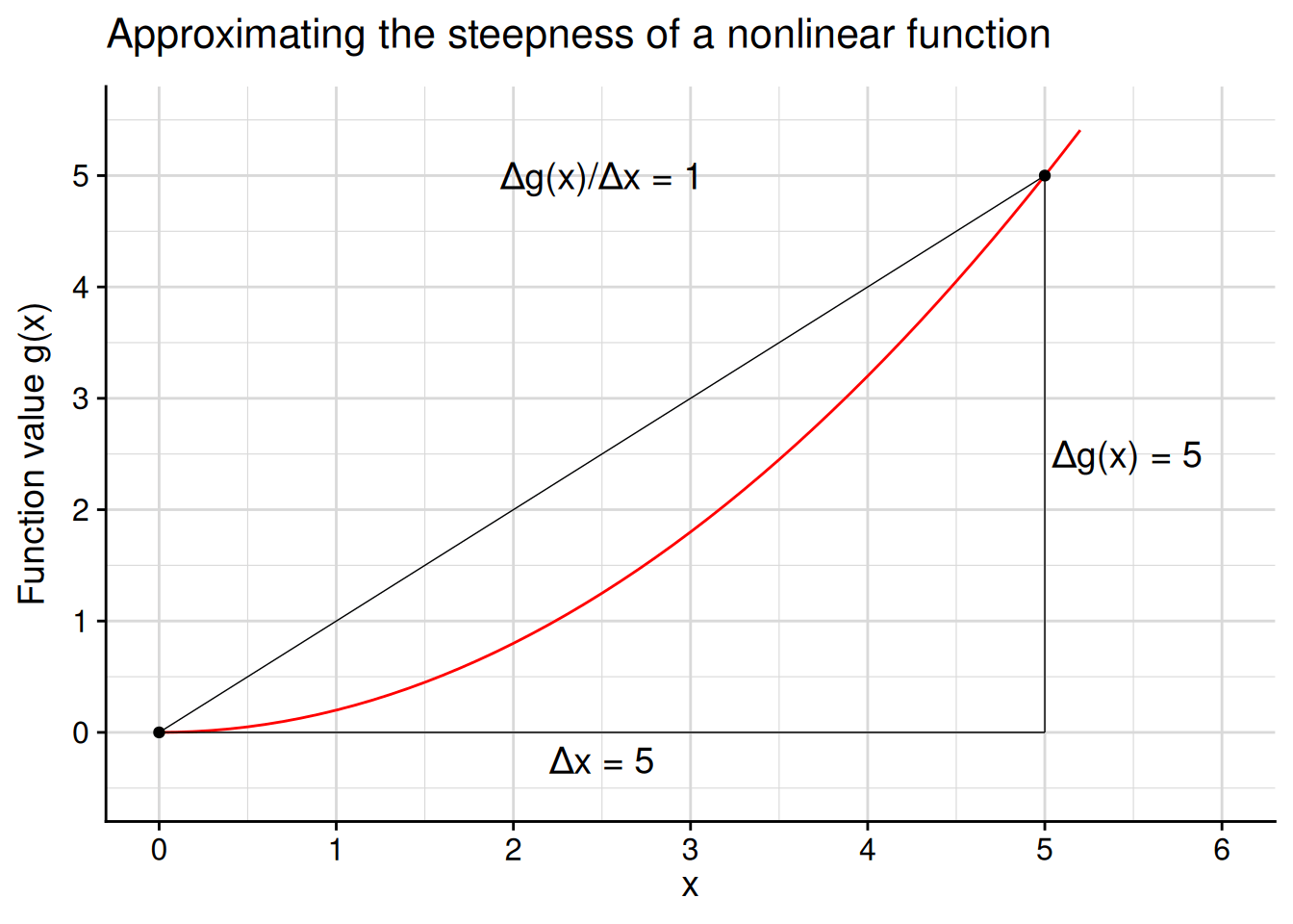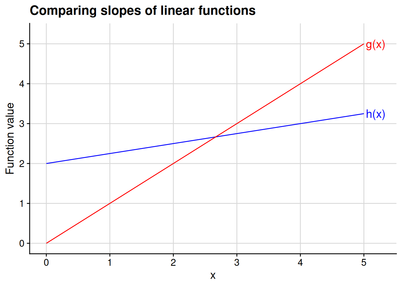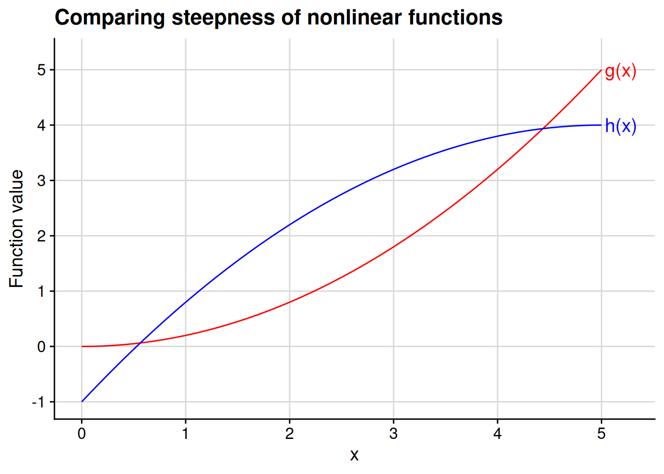 At the leftmost part of the figure, close to \(x = 0\), the red function \(g(x)\) is nearly flat while the blue function \(h(x)\) is clearly increasing. By contrast, at the rightmost part of the figure, close to \(x = 5\), we see that \(g(x)\) is clearly increasing while \(h(x)\) is nearly flat. We can glean that much through the eyeball test. But how can we quantify the “steepness” of each function at each point? Is there a precise way to say that a function is “nearly flat” at a particular point? And how can we identify the crossover point, where \(g(x)\) starts to increase more steeply than \(h(x)\) does?