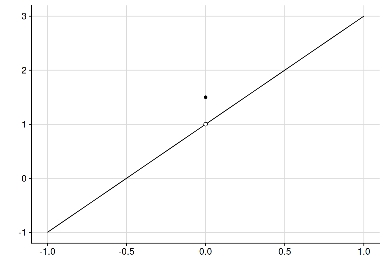 Example 4.1 (Using the formal definition of a function limit) We are working with the function depicted in Figure 4.6, namely \[ f(x) = \begin{cases} 1 + 2x & \text{if $x \neq 0$}, \\ 1.5 & \text{if $x = 0$}. \end{cases} \] It seems clear from the illustration that \(\lim_{x \to 0} f(x) = 1\), but how can we show this formally using Definition 4.1?