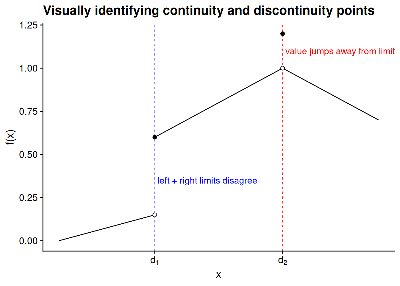 For most functions you’d deal with in practice, you can tell where the function is continuous and where it is not by looking at the graph. At any point where the left- and right-hand limits do not agree, the function is discontinuous. It is also discontinuous at any point where the limits agree but the function value itself “jumps.” At all other points, the function is continuous.