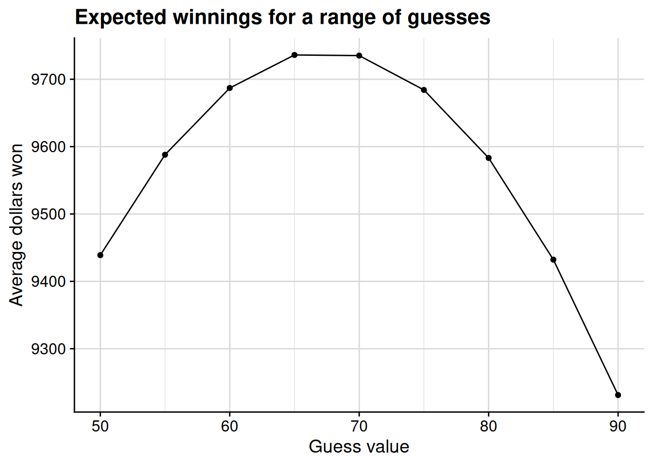 With a guess of 70, on average we win $9735.09. That sounds pretty good, but can we do even better?