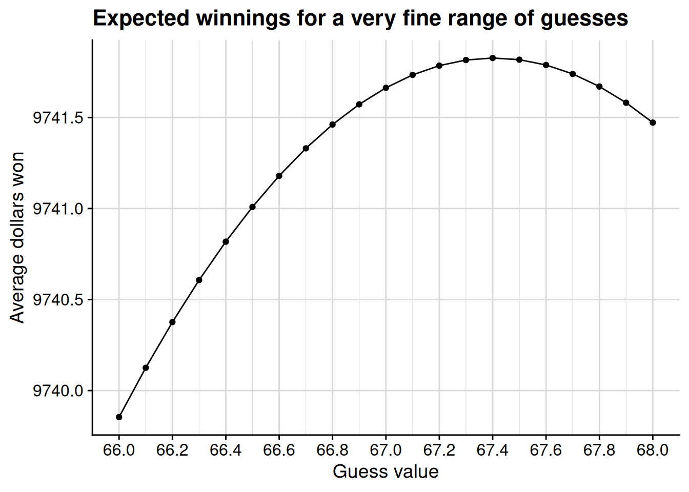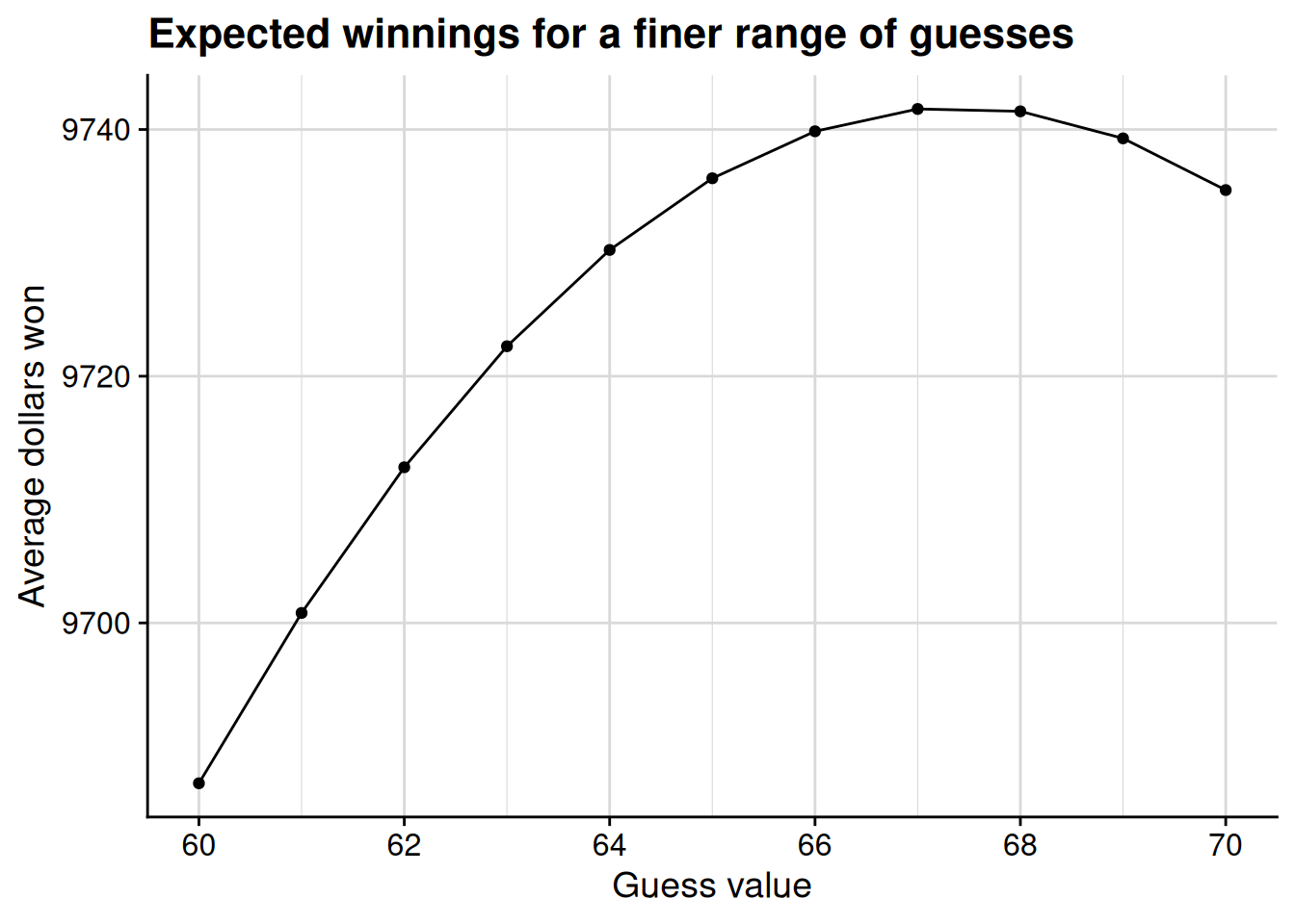 It looks like we slightly overshot with our initial guess of 70, as we would expect to win slightly more by guessing 65 instead. But can we do even better than 65? To check, let’s narrow our focus to the 60–70 range, going in increments of 1 instead of 5.