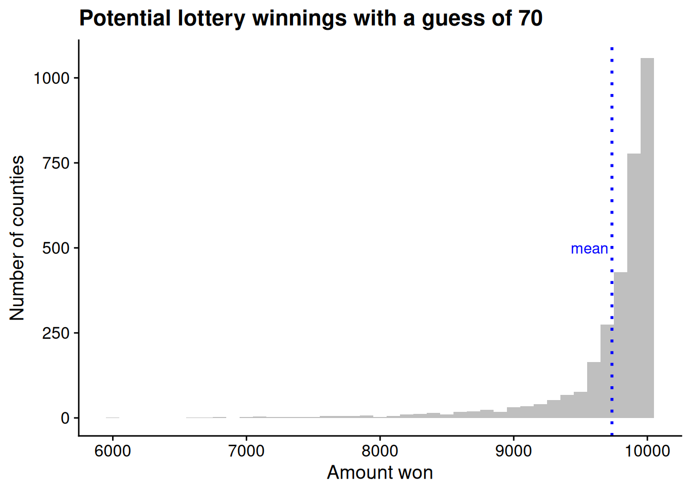 Let’s calculate how much we could expect to win from the lottery if we were to make a guess of 70. For each of the 3,188 balls in the lottery drum, we can calculate how much we would win if that ball happened to be the one that were drawn. For example, Trump’s worst county in the data, unsurprisingly, is the District of Columbia, where he got just 6.7% of the two-party vote. If we guessed 70 and happened to draw the DC ball, we would be off by 63.3, leaving us with winnings of $5993.11. Repeating this process for each ball in the lottery drum, Figure 4.2 illustrates the distribution of how much we would win for each ball that could be drawn.