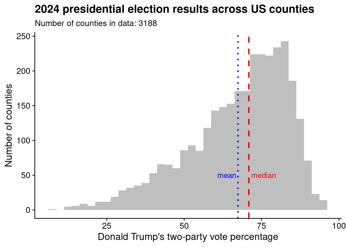 To give this game a political twist, let’s assume there’s one ball for every county in the United States, and each ball is labeled with Donald Trump’s two-party vote percentage in that county in the 2024 presidential election. Figure 4.1 illustrates the distribution of labels on the lottery balls. The distribution is left-skewed: the mean value, 67.4, is slightly less than the median, 70.9.
