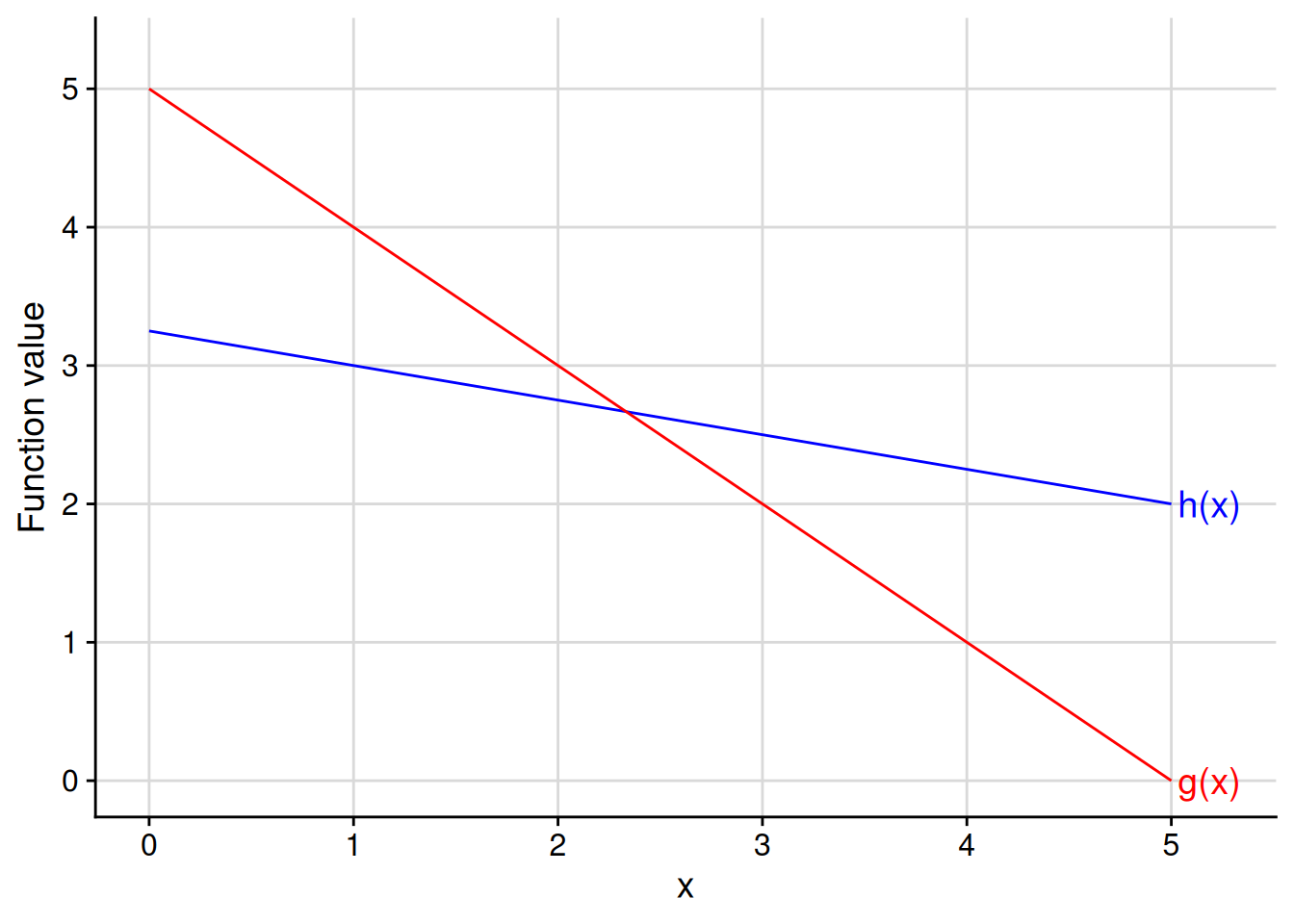 Finally, let’s find the crossover point at which \(g\) becomes steeper than \(h\), i.e., at which \(g'(x) > h'(x)\). We know that \(g'(x) = \frac{2x}{5}\) and that \(h'(x) = 2 - \frac{2x}{5}\). The statement \(g'(x) > h'(x)\) is therefore equivalent to \[\frac{2x}{5} > 2 - \frac{2x}{5},\] which in turn is equivalent to \[\frac{4x}{5} > 2.\] This statement in turn is equivalent to \[x > 2 \cdot \frac{5}{4} = \frac{10}{4} = 2.5,\] so the crossover point is \(x = 2.5\).
