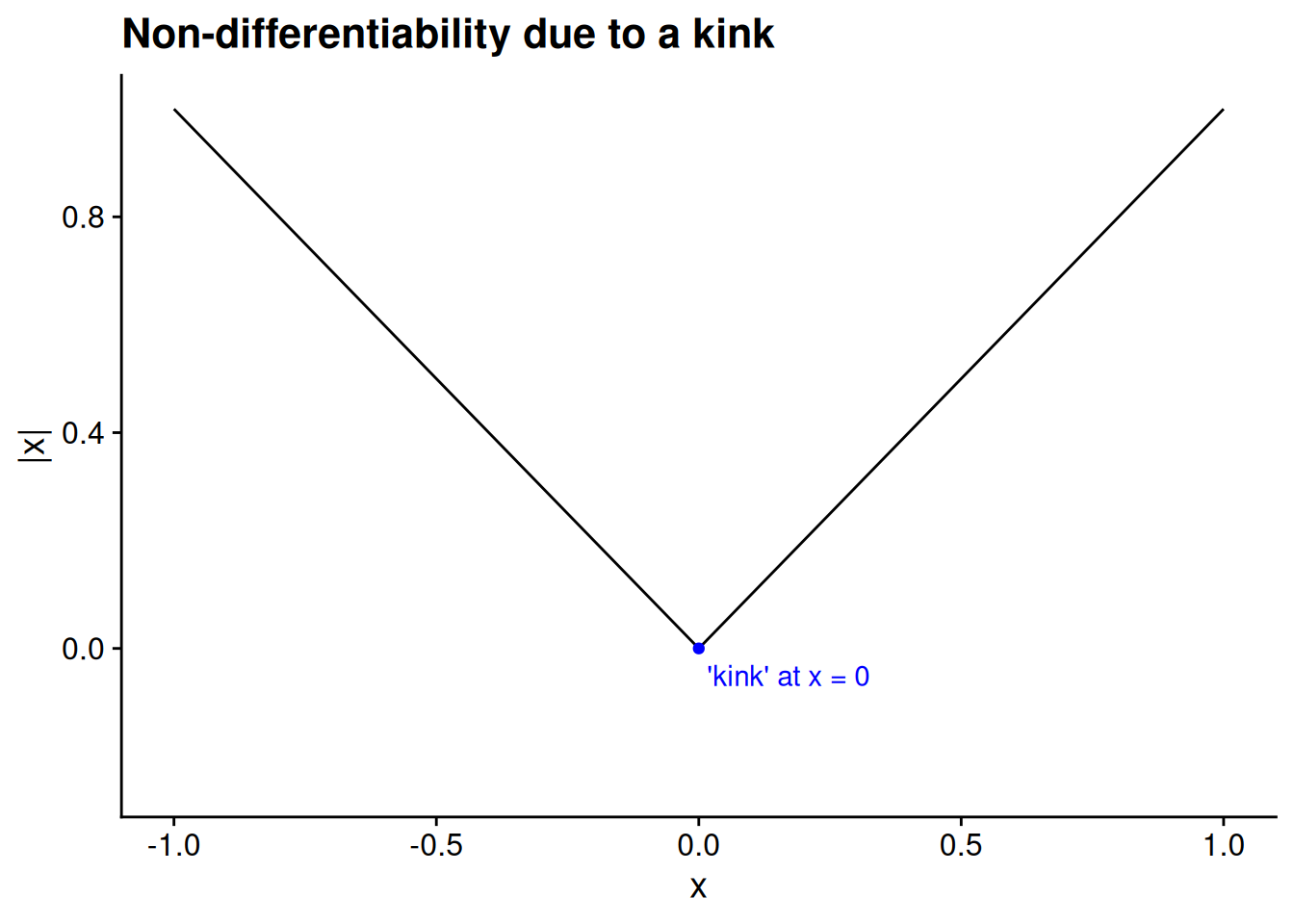 The most common type of non-differentiability in a continuous function that you’ll run into is a “kink” in the graph of the function — a point where the direction of the function appears to change sharply instead of smoothly. The absolute value function illustrates this type of non-differentiability.