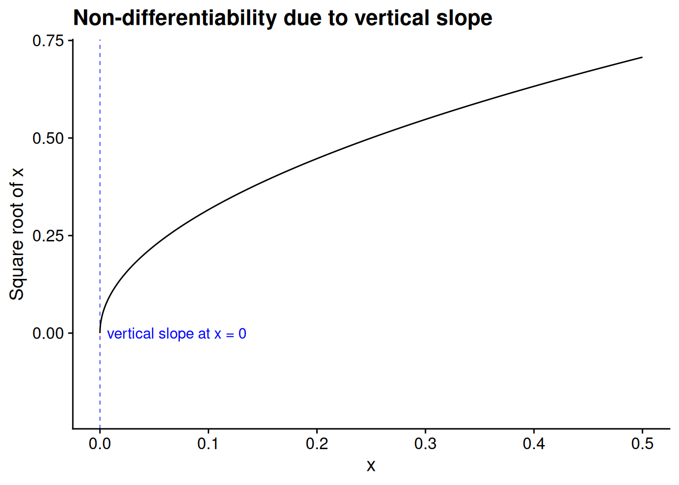 Another source of non-differentiability is when the function is so steep that its graph approaches a vertical line. As an example, take the square root function, \(f(x) = \sqrt{x},\) evaluated at the point \(c = 0.\) The “rise over run” limit here becomes infinitely large as \(x \to 0:\) \[ \begin{aligned} \lim_{x \to 0} \frac{f(x) - f(0)}{x - 0} &= \lim_{x \to 0} \frac{\sqrt{x}}{x} \\ &= \lim_{x \to 0} \frac{1}{\sqrt{x}} \\ &= \infty. \end{aligned} \]