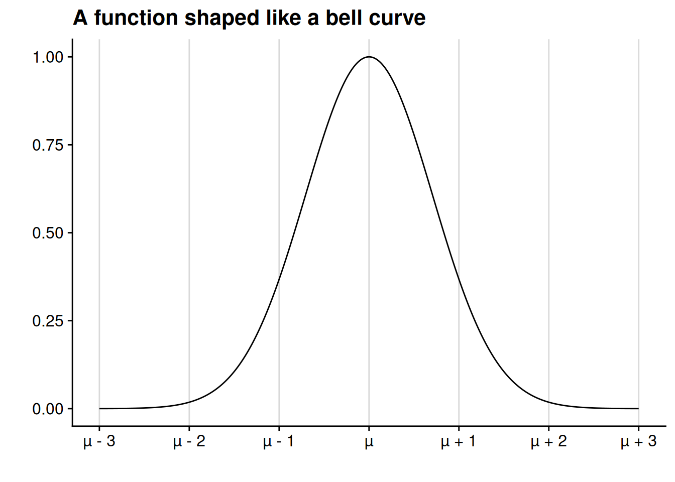 Using the chain rule with our example of \(h(x) = e^{-(x - \mu)^2},\) we can calculate the derivative: \[ \begin{aligned} h'(x) &= f'(g(x)) \cdot g'(x) \\ &= f'(-(x - \mu)^2) \cdot g'(x) \\ &= e^{-(x - \mu)^2} \cdot 2 (\mu - x) \\ &= 2 (\mu - x) e^{-(x - \mu)^2}. \end{aligned} \] If we look at the graph of this function, we see that it increases on \((-\infty, \mu)\) and decreases on \((\mu, \infty)\).