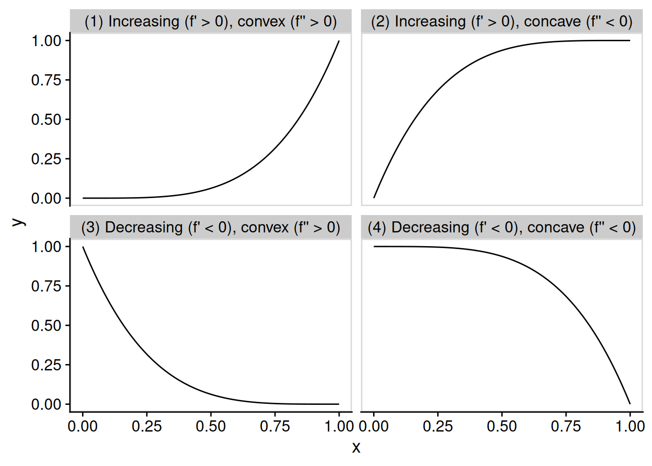 Sometimes in formal theory papers, you’ll see a function described just in terms of its first and second derivatives. For instance, I might write, “Let \(f : [0, 1] \to [0, 1]\) be twice differentiable, with \(f' > 0\) and \(f'' < 0.\) Here’s a little cheat sheet to interpret statements like that one.
