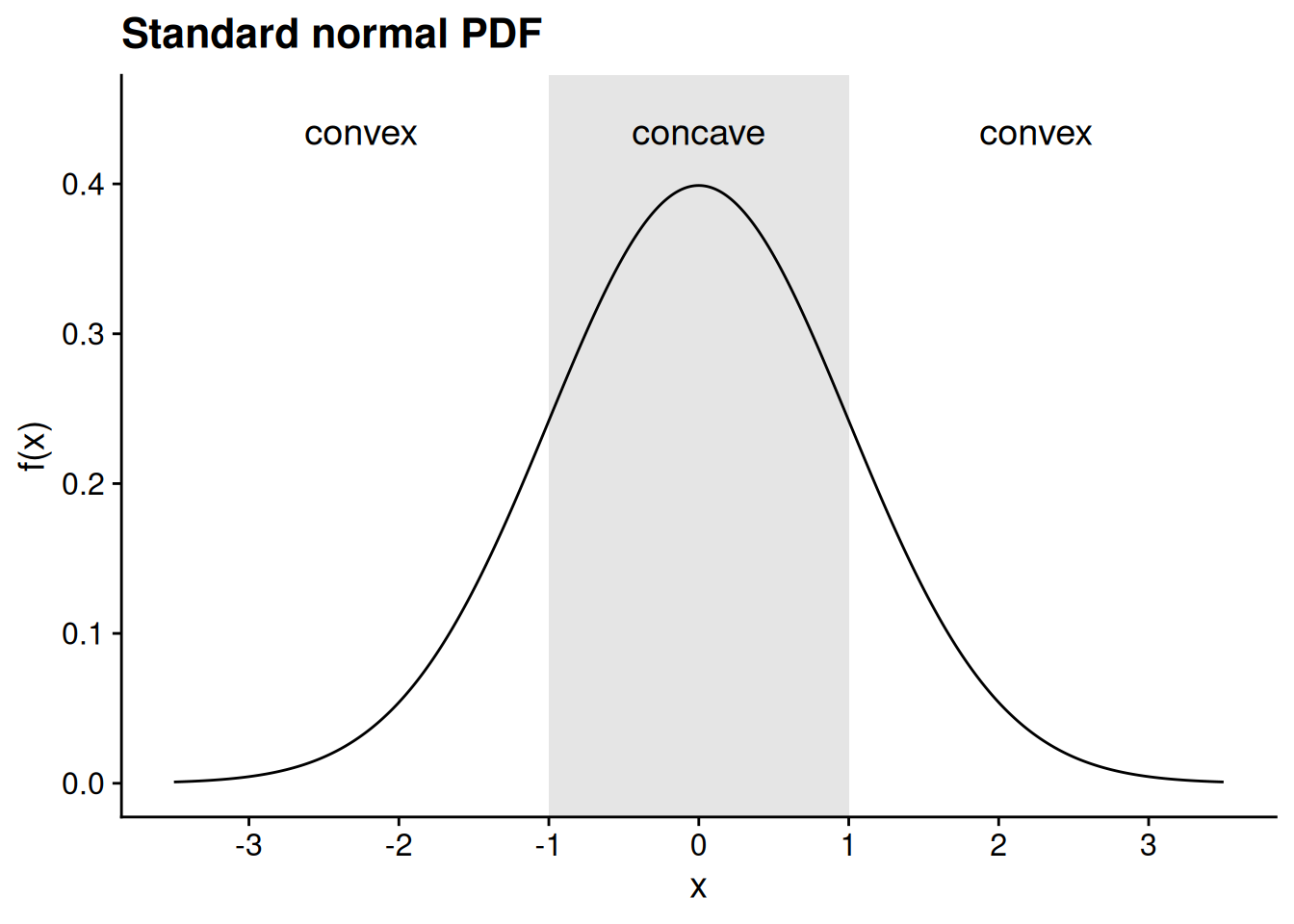 Exercise 4.26 (Concave portion of the normal PDF) A function can be concave on part of its domain and convex on other parts. For example, take the probability density function of the standard normal distribution, \(f(x) = \frac{1}{\sqrt{2 \pi}} e^{-x^2 / 2}.\)