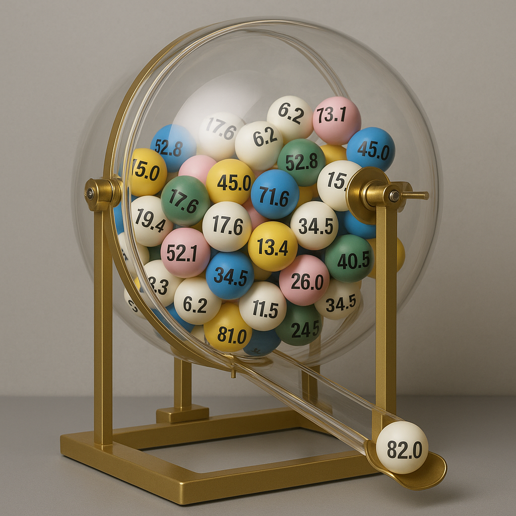 Let’s imagine a tweak on a traditional lottery. We fill the lottery drum with \(N\) balls, each of which is labeled with a real number between 0 and 100. You get to look at all of the labels, then you pick a number. We spin the drum and choose a single lottery ball at random. The most you can win — if you guessed the number exactly — is $10,000. If your guess wasn’t exact, your winnings are reduced by the square of the difference between your guess and the number that was drawn. For example, if you guessed 40 and the ball that was drawn said 52, meaning you were off by 12, you’d get $9,856: \[10{,}000 - 12^2 = 10{,}000 - 144 = 9{,}856.\]